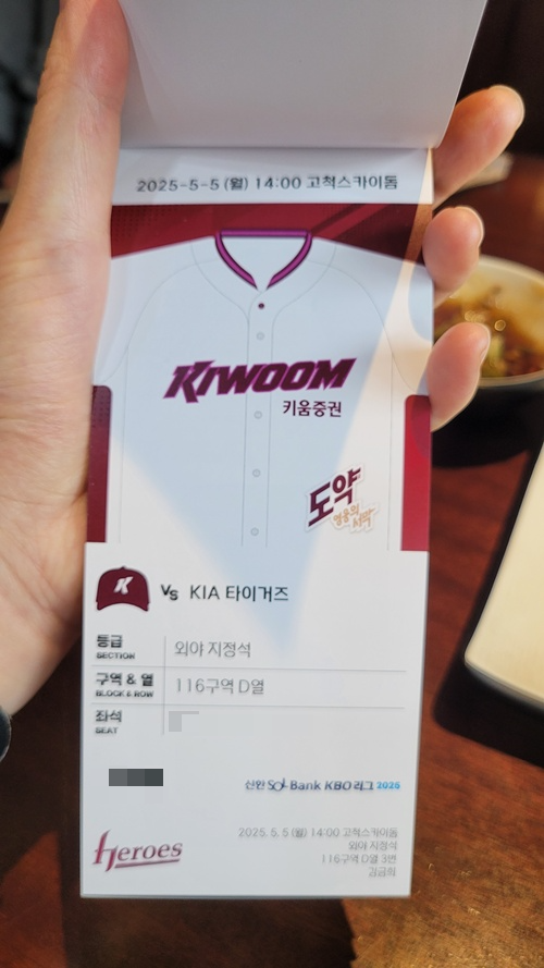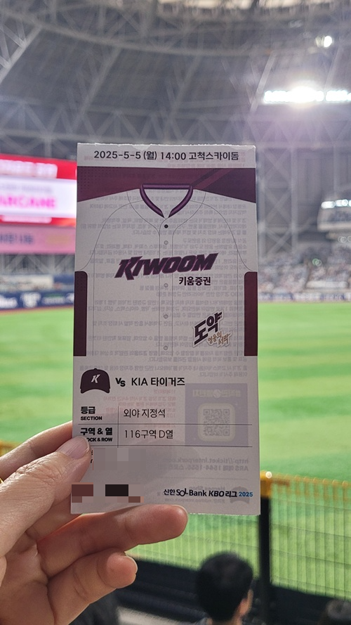 고척 스카이돔 고척돔에서 2025년 5월5일 어린이날 오후 1시 키움과 KIA 기아 경기를 관람했습니다. 외야 지정석 116구역 D열 시야 및 직관 후기 알려드리겠습니다.