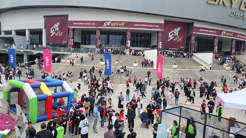 경기장 앞 광장에 어린이들을 위한 행사가 진행되고 있었구요, 2시 경기라 여유롭게 1시20분 쯤 도착을 했는데, 외야 대기줄이 어마어마하게 길더라구요.